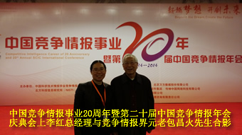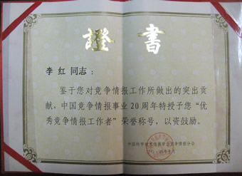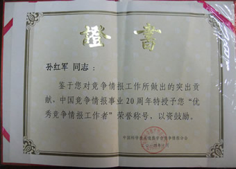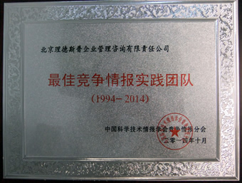 由于對(duì)競(jìng)爭(zhēng)情報(bào)事業(yè)所做的突出貢獻(xiàn),理德斯普公司榮獲“最佳競(jìng)爭(zhēng)情報(bào)實(shí)踐團(tuán)隊(duì)”獎(jiǎng),董事長(zhǎng)孫紅軍和總經(jīng)理李紅也分別被授予“優(yōu)秀競(jìng)爭(zhēng)情報(bào)工作者”榮譽(yù)稱(chēng)號(hào)。